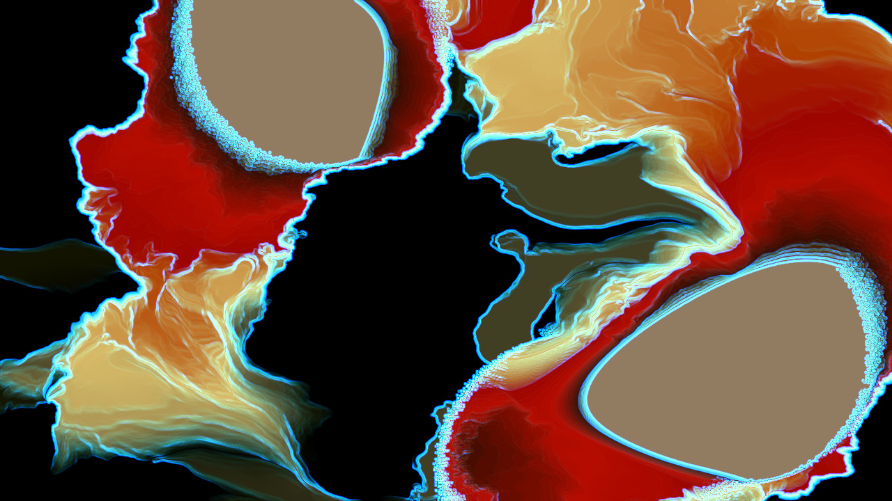 The fluid simulation moves through four states inspired by stellar lifecycles, each driven by the collective chaos score.